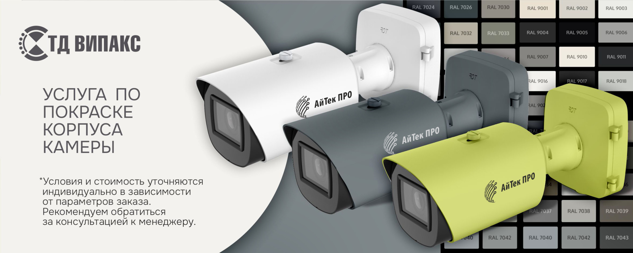 Компания ВИПАКС предлагает новую услугу — окраску камер видеонаблюдения АйТек ПРО в любой цвет.